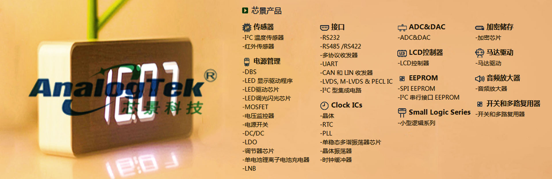 產(chǎn)品包括:超低功耗2.4GHz數(shù)據(jù)通信芯片、2.4GHz有源RFID芯片、13.56MHz非接觸式讀卡器芯片和125KHz低頻觸發(fā)芯片、衛(wèi)星導(dǎo)航定位芯片、導(dǎo)航模塊,授時(shí)模塊,步進(jìn)馬達(dá)驅(qū)動(dòng)類(lèi)芯片,模擬安防類(lèi)芯片,音頻功放IC、電機(jī)驅(qū)動(dòng)IC、電源管理IC、D/A轉(zhuǎn)換器等。